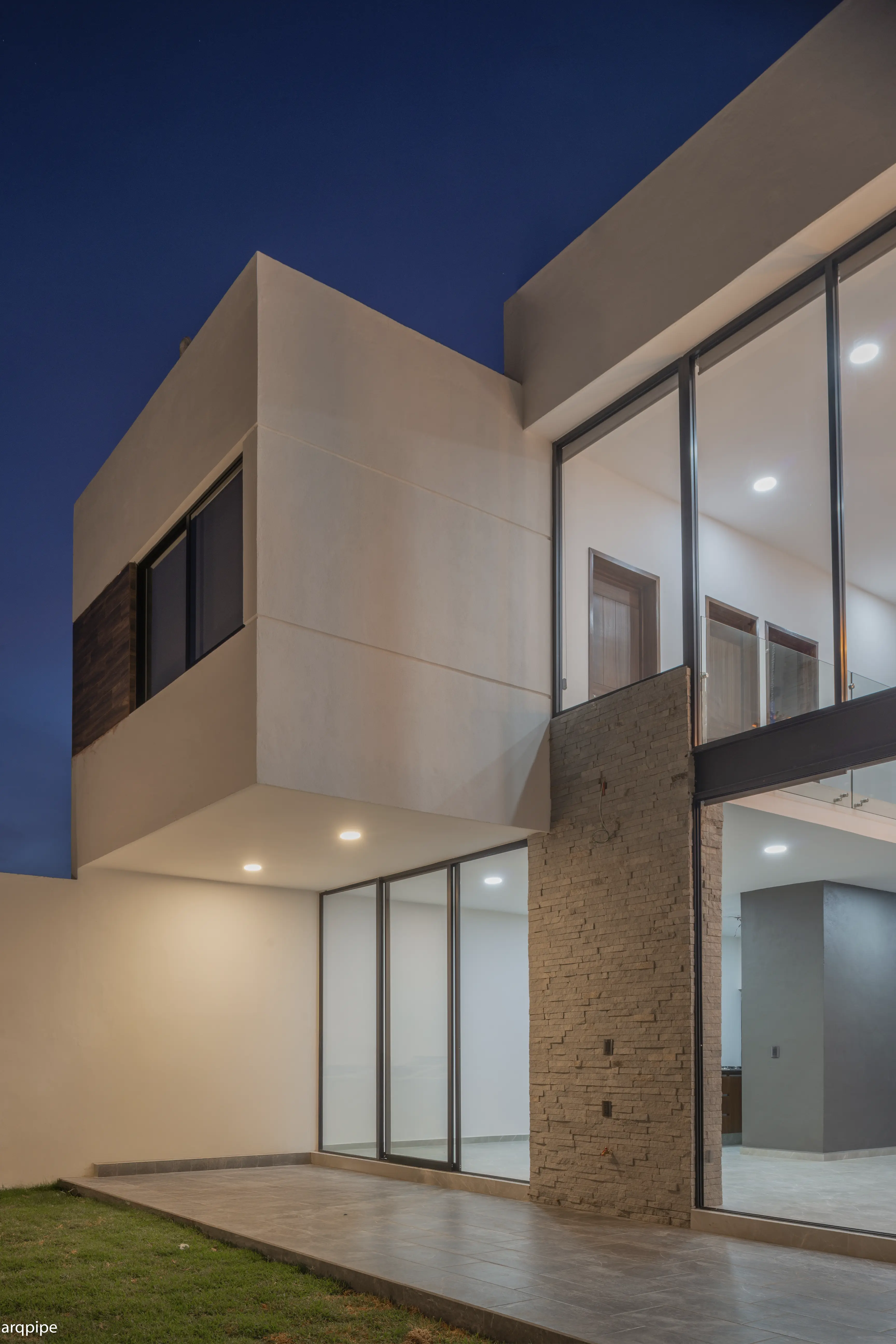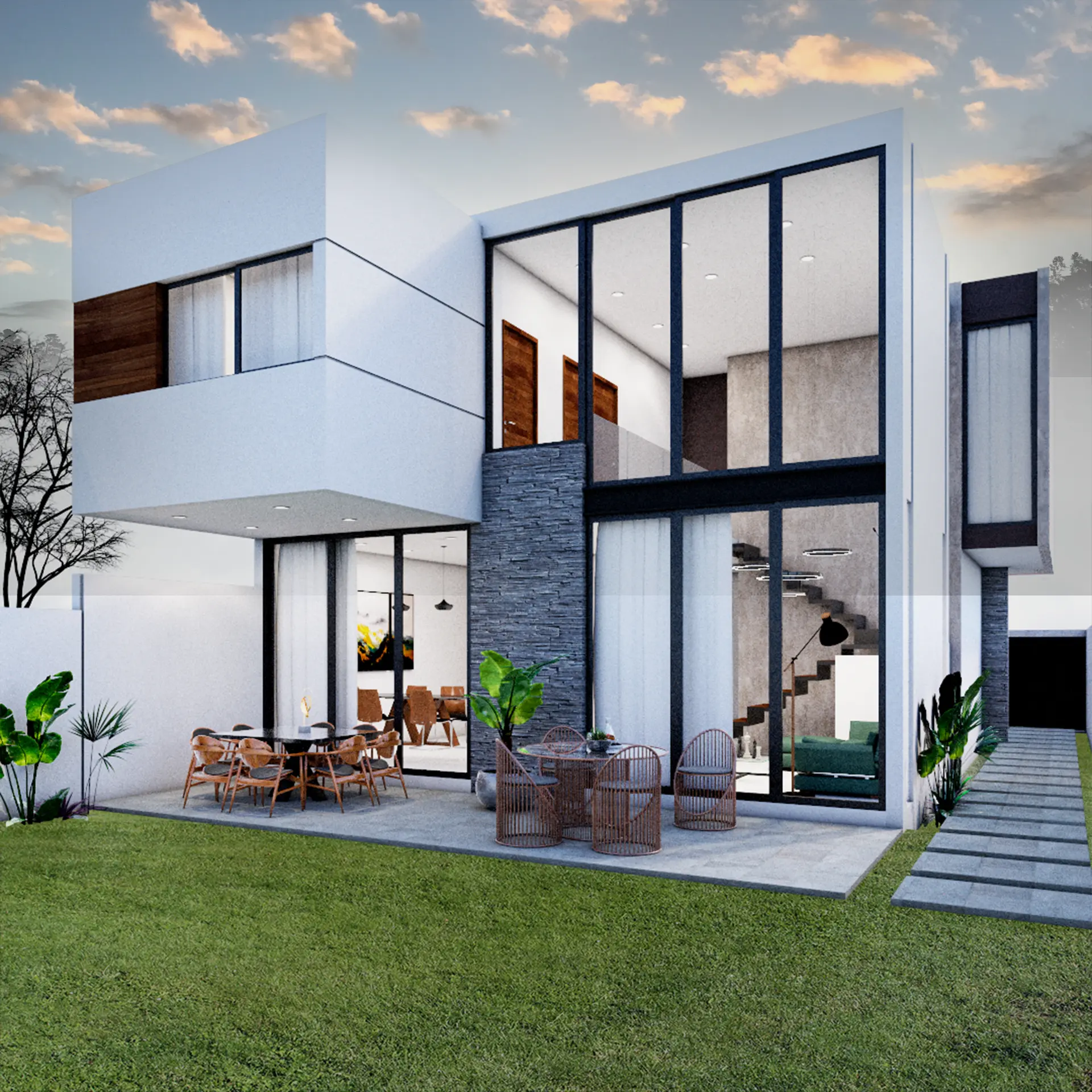 Contrastamos esta ligereza metálica con un basamento de piedra brasa oscura. Este material, extraído de la región, aporta inercia térmica (retrasando la entrada del calor al interior) y ancla visualmente la casa al terreno, dándole una sensación de permanencia y fuerza tectónica que envejece con dignidad.