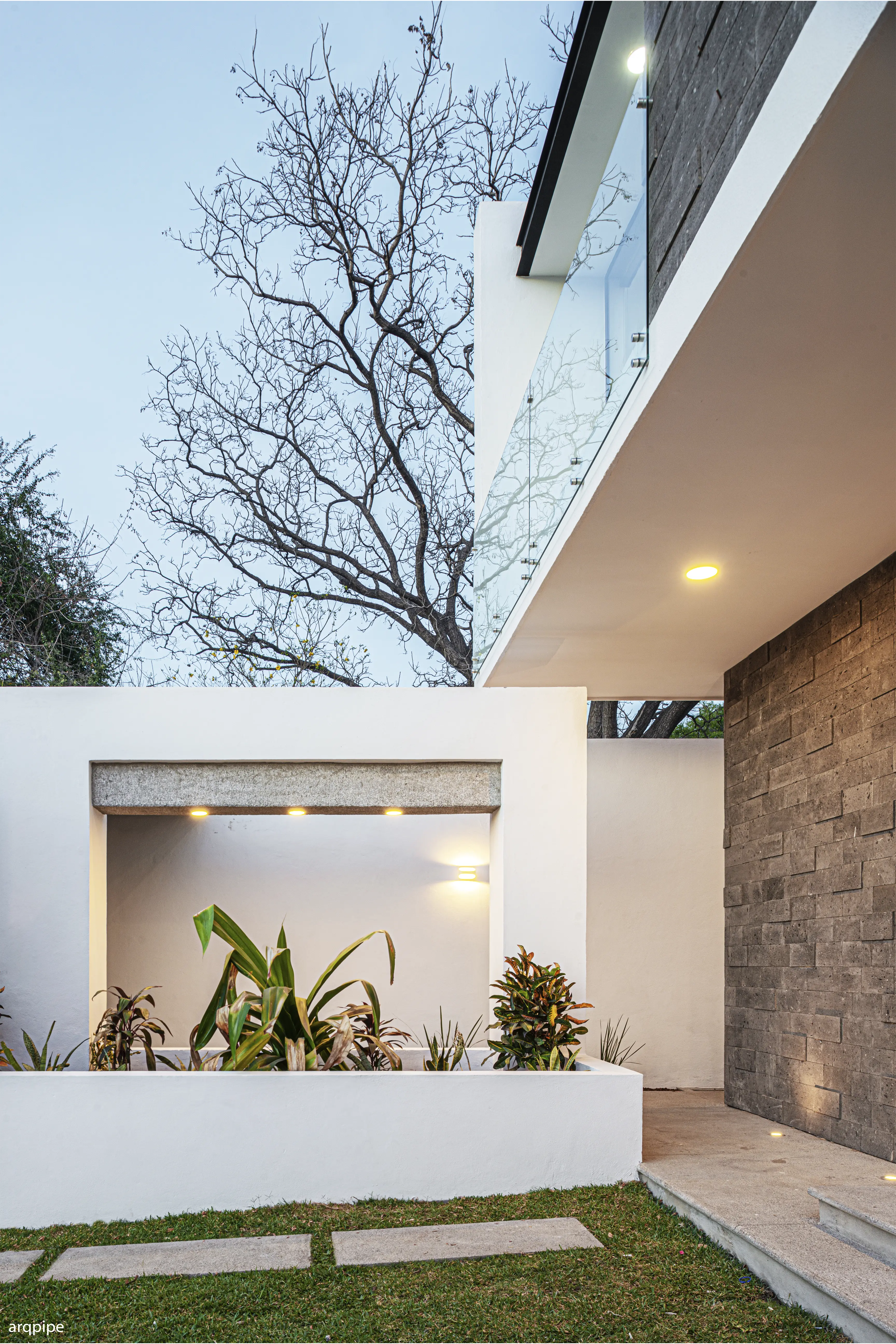 El diseño del paisaje no es un añadido, es funcional: la vegetación y el agua generan un microclima húmedo que enfría el aire antes de que cruce la estancia mediante ventilación cruzada.
